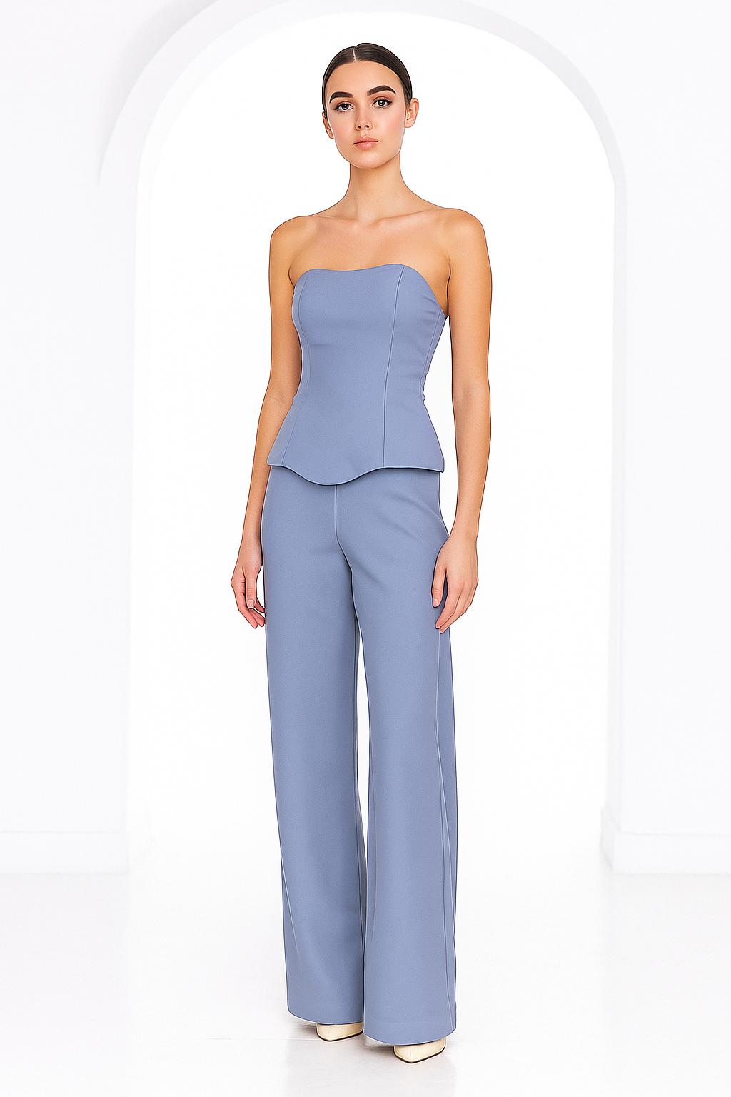 Wave ended corset top with wide-leg pants in the color baby blue